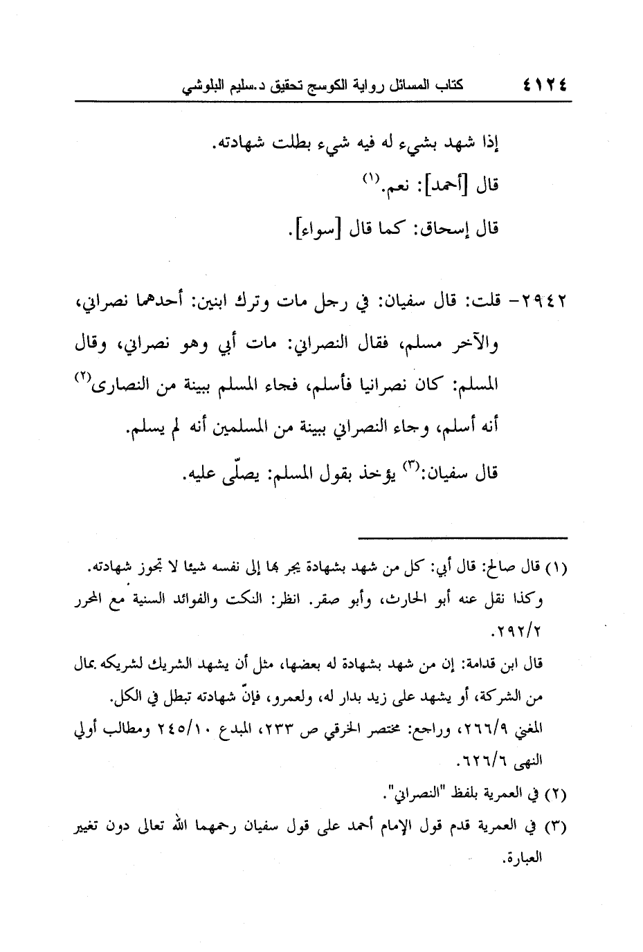 [2942-] قلت: قال سفيان: في رجل مات وترك ابنين: أحدهما نصراني، والآخر مسلم، فقال النصراني: مات أبي وهو نصراني، وقال المسلم: كان نصرانيا فأسلم، فجاء المسلم ببينة من النصارى 2 أنه أسلم، وجاء النصراني ببينة من المسلمين أنه لم يسلم.