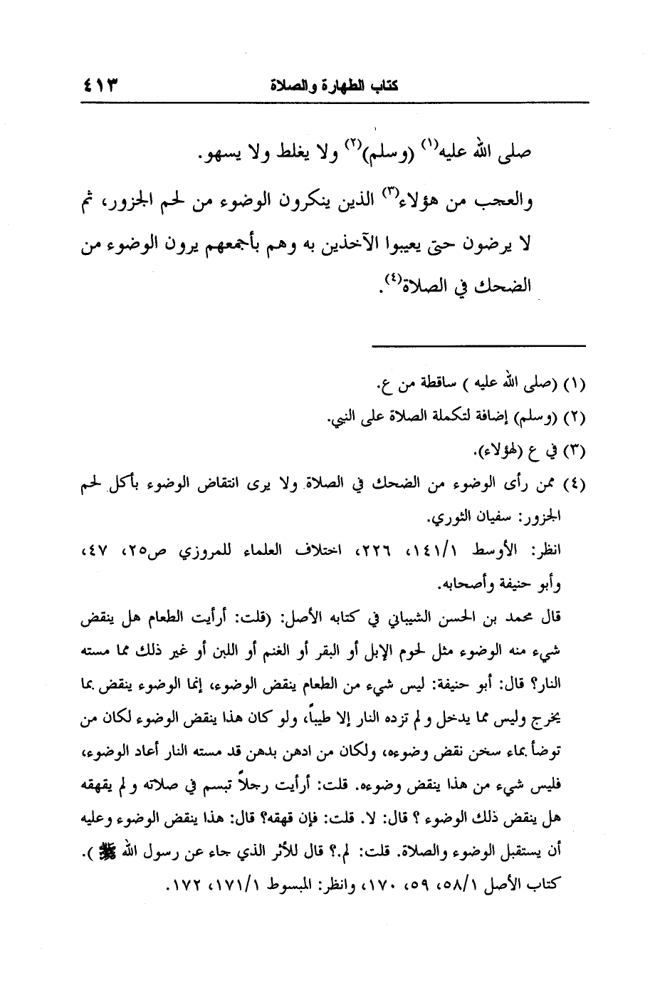 والعجب من هؤلاء3 الذين ينكرون الوضوء من لحم الجزور، ثم لا يرضون حتى يعيبوا الآخذين به وهم بأجمعهم يرون الوضوء من الضحك في الصلاة4.