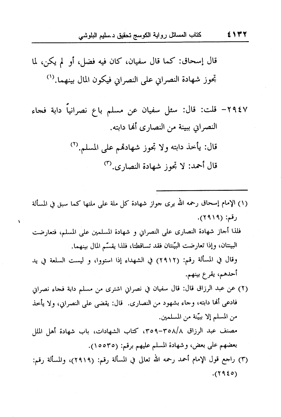 1 الإمام إسحاق رحمه الله يرى جواز شهادة كل ملة على ملتها كما سبق في المسألة رقم: (2919) .