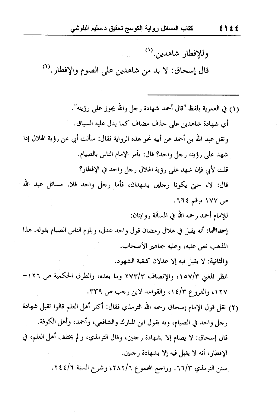 2 نقل قول الإمام إسحاق رحمه الله الترمذي فقال: أكثر أهل العلم قالوا تقبل شهادة رجل واحد في الصيام، وبه يقول ابن المبارك والشافعي، وأحمد، وأهل الكوفة.