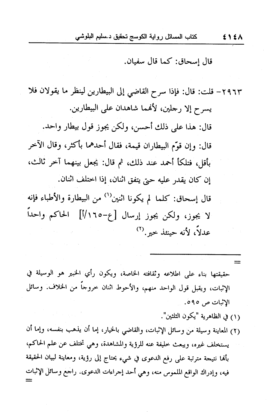 [2963-] قلت: قال: فإذا سرح القاضي إلى البيطارين لينظر ما يقولان فلا يسرح إلا رجلين، لأنهما شاهدان على البيطارين.