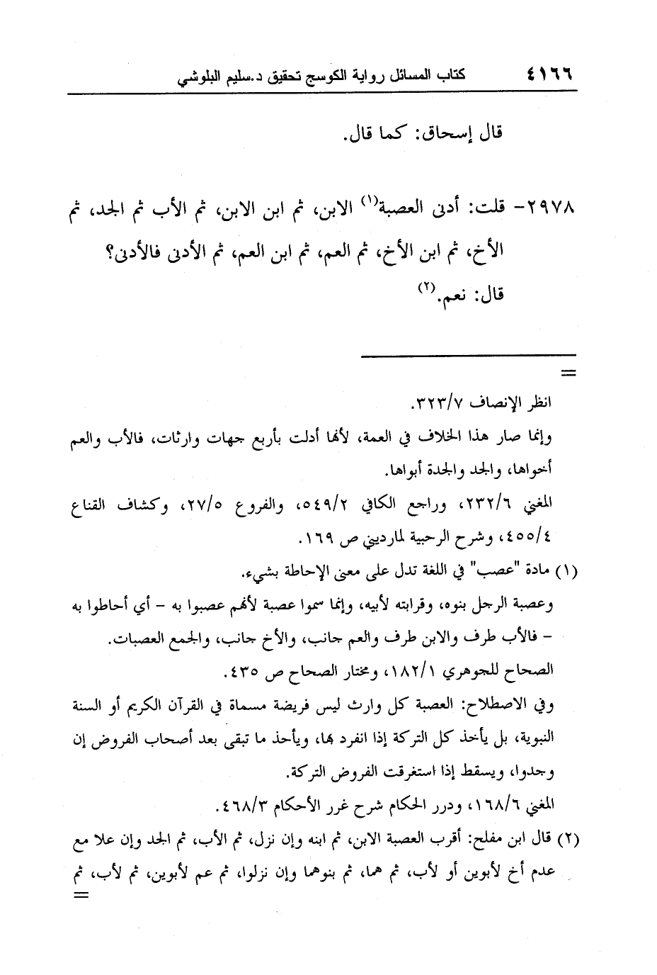 [2978-] قلت: أدنى العصبة 1 الابن، ثم ابن الابن، ثم الأب ثم الجد، ثم الأخ، ثم ابن الأخ، ثم العم، ثم ابن العم، ثم الأدنى فالأدنى؟