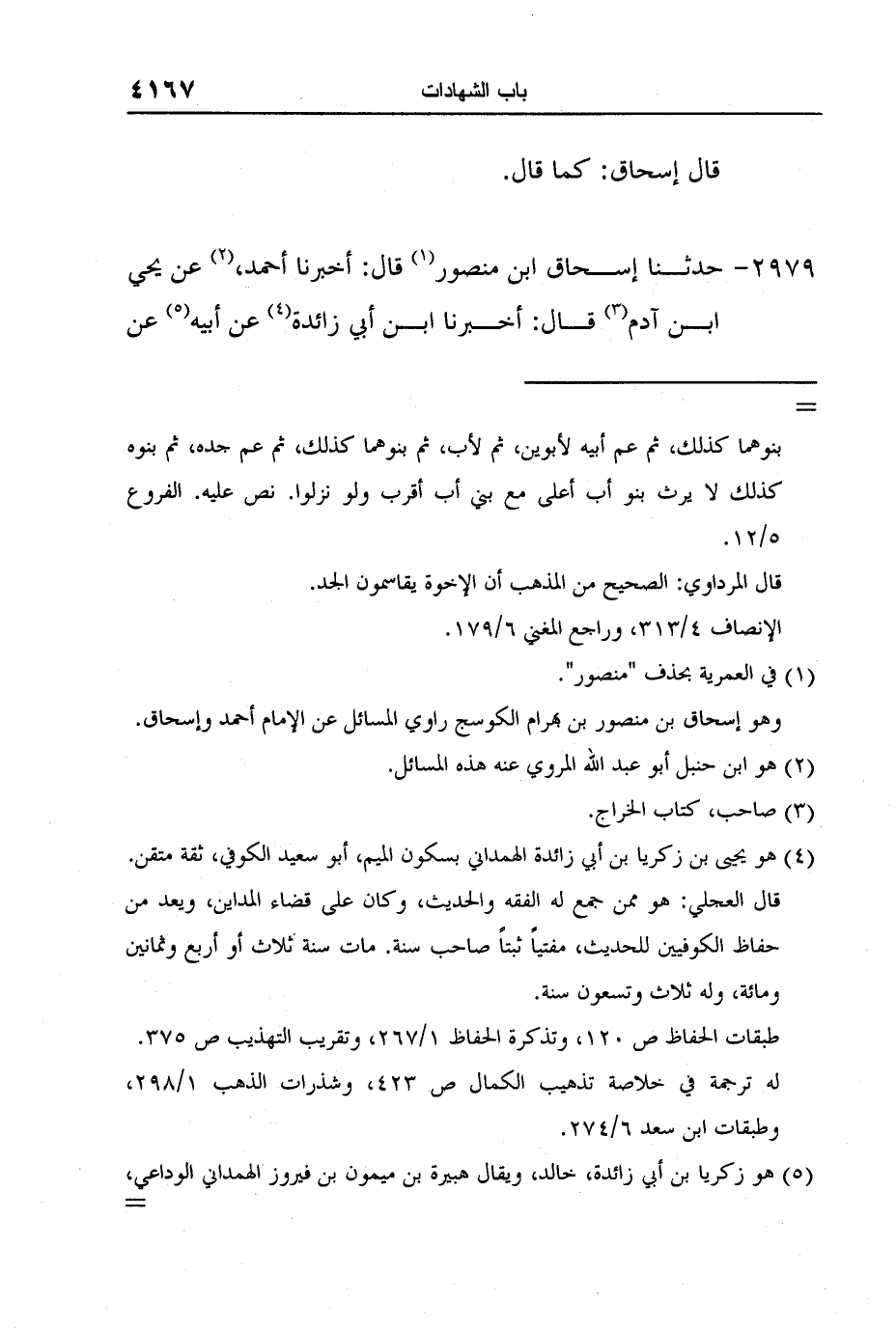 [2979-] حدثنا إسحاق ابن منصور 1 قال: أخبرنا أحمد، 2 عن يحي ابن آدم 3 قال: أخبرنا ابن أبي زائدة 4 عن أبيه 5 عن