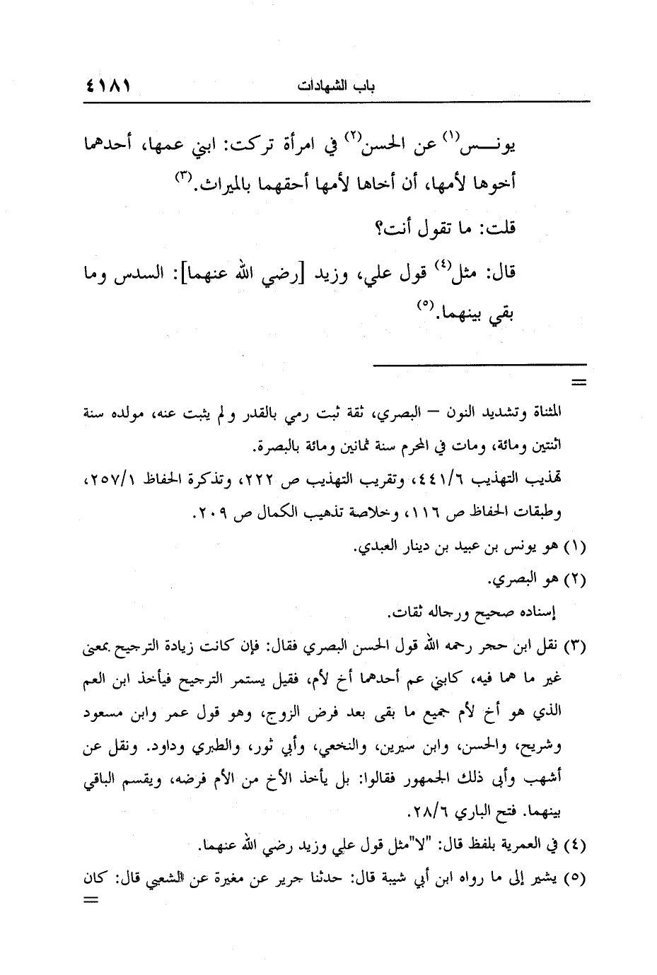 3 نقل ابن حجر رحمه الله قول الحسن البصري فقال: فإن كانت زيادة الترجيح بمعنى غير ما هما فيه، كابني عم أحدهما أخ لأم، فقيل يستمر الترجيح فيأخذ ابن العم الذي هو أخ لأم جميع ما بقى بعد فرض الزوج، وهو قول عمر وابن مسعود وشريح، والحسن، وابن سيرين، والنخعي، وأبي ثور، والطبري وداود. ونقل عن أشهب وأبى ذلك الجمهور فقالوا: بل يأخذ الأخ من الأم فرضه، ويقسم الباقي بينهما. فتح الباري 6/28.