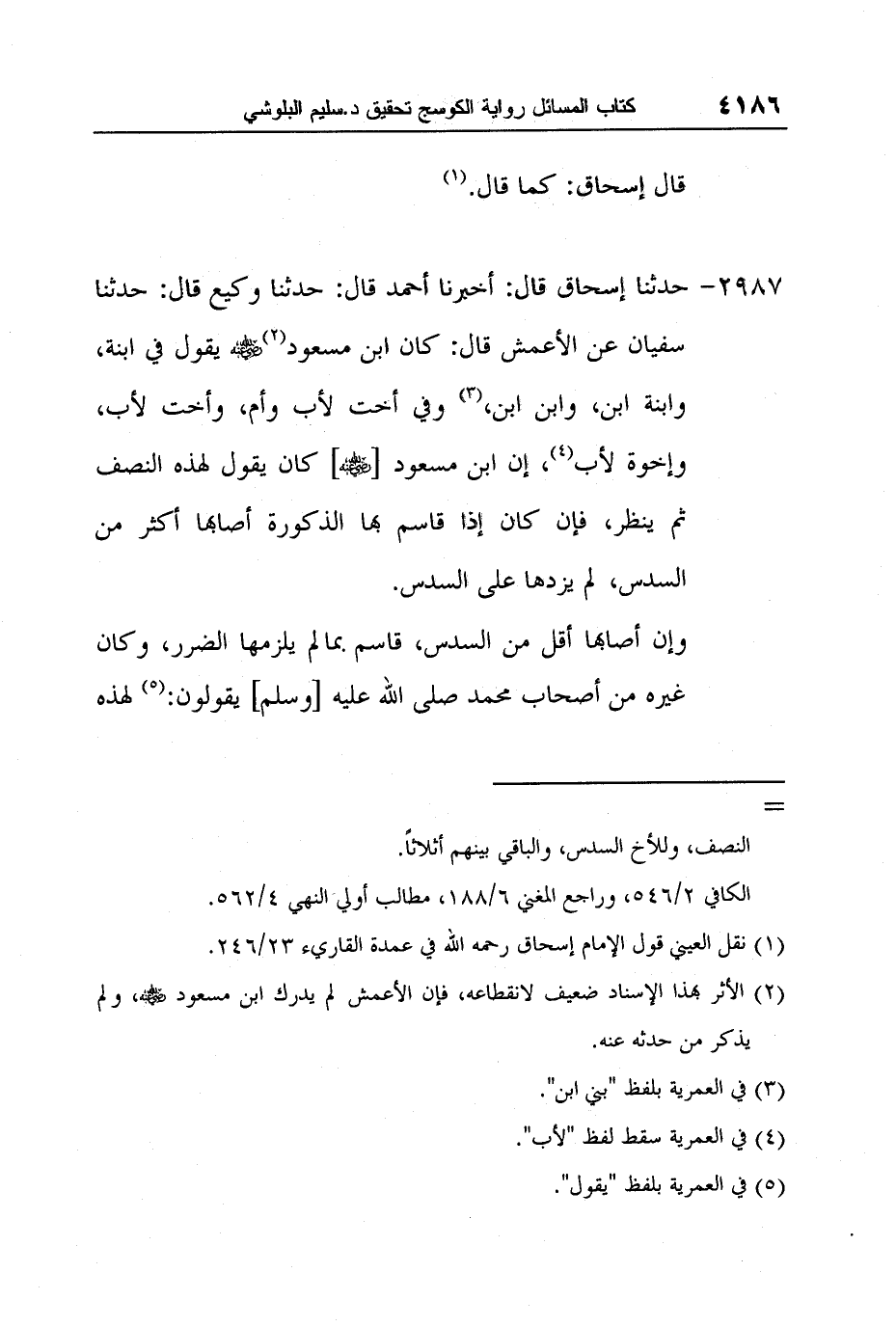 [2987-] حدثنا إسحاق قال: أخبرنا أحمد قال: حدثنا وكيع قال: حدثنا سفيان عن الأعمش قال: كان ابن مسعود 2 رضي الله عنه يقول في ابنة، وابنة ابن، وابن ابن، 3 وفي أخت لأب وأم، وأخت لأب، وإخوة لأب 4، إن ابن مسعود [رضي الله عنه] كان يقول لهذه النصف ثم ينظر، فإن كان إذا قاسم بها الذكورة أصابها أكثر من السدس، لم يزدها على السدس.