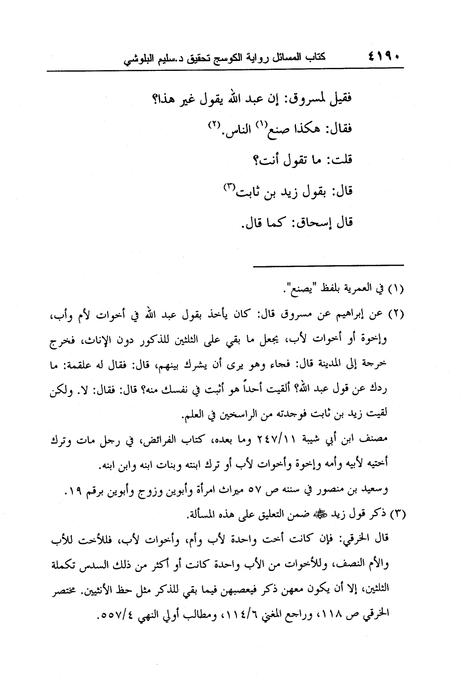 2 عن إبراهيم عن مسروق قال: كان يأخذ بقول عبد الله في أخوات لأم وأب، وإخوة أو أخوات لأب، يجعل ما بقي على الثلثين للذكور دون الإناث، فخرج خرجة إلى المدينة قال: فجاء وهو يرى أن يشرك بينهم، قال: فقال له علقمة: ما ردك عن قول عبد الله؟ ألقيت أحداً هو أثبت في نفسك منه؟ قال: فقال: لا. ولكن لقيت زيد بن ثابت فوجدته من الراسخين في العلم.