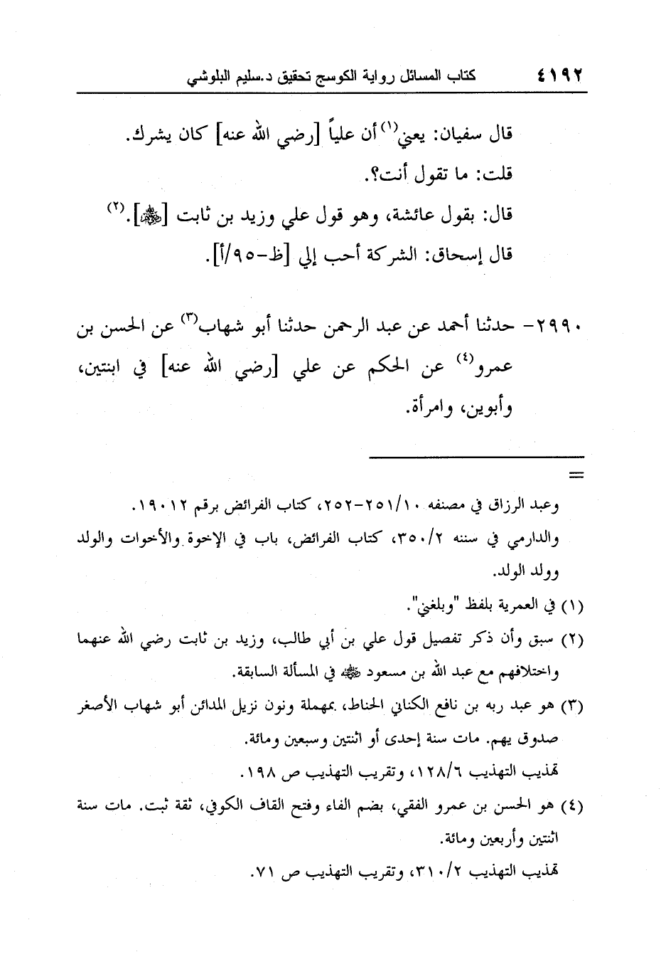 2 سبق وأن ذكر تفصيل قول علي بن أبي طالب، وزيد بن ثابت رضي الله عنهما واختلافهم مع عبد الله بن مسعود رضي الله عنه في المسألة السابقة.