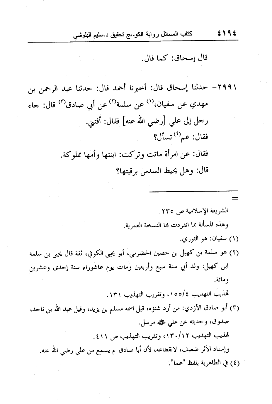 [2991-] حدثنا إسحاق قال: أخبرنا أحمد قال: حدثنا عبد الرحمن بن مهدي عن سفيان، 1 عن سلمة 2 عن أبي صادق 3 قال: جاء رجل إلى علي [رضي الله عنه] فقال: أفتني.
