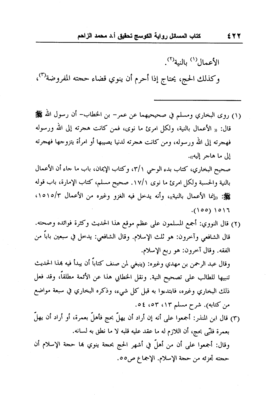 1 روى البخاري ومسلم في صحيحيهما عن عمر- بن الخطاب- أن رسول الله صلى الله عليه وسلم قال: "الأعمال بالنية، ولكل امرئ ما نوى، فمن كانت هجرته إلى الله ورسوله فهجرته إلى الله ورسوله، ومن كانت هجرته لدنيا يصيبها أو امرأة يتزوجها فهجرته إلى ما هاجر إليه".