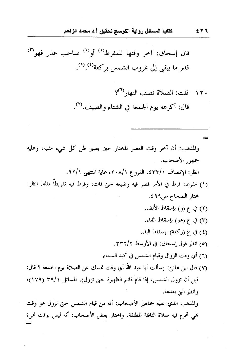 7 قال ابن هانئ: (سألت أبا عبد الله أي وقت تمسك عن الصلاة يوم الجمعة؟ قال: قبل أن تزول الشمس، إذا قام قائم الظهيرة حتى تزول) . المسائل 1/39 (179) ، وانظر التي بعدها.