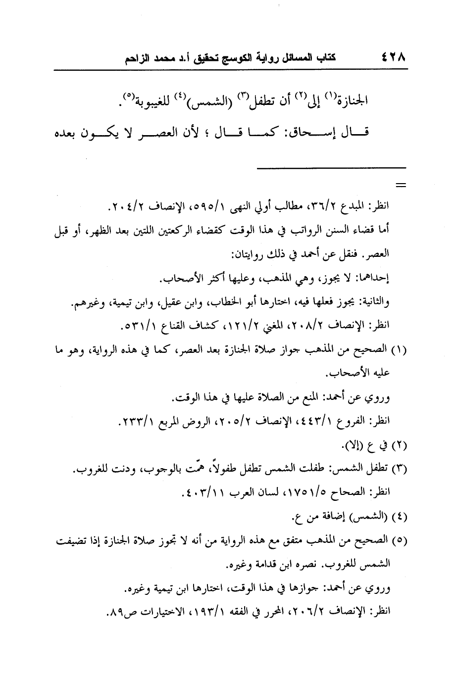 5 الصحيح من المذهب متفق مع هذه الرواية من أنه لا تجوز صلاة الجنازة إذا تضيفت الشمس للغروب. نصره ابن قدامة وغيره.