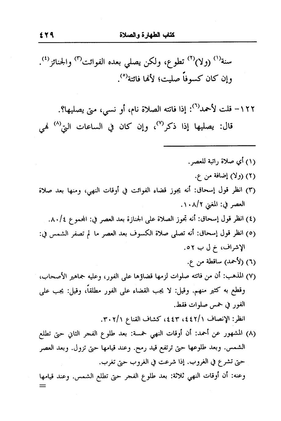 8 المشهور عن أحمد: أن أوقات النهي خمسة: بعد طلوع الفجر الثاني حتى تطلع الشمس. وبعد طلوعها حتى ترتفع قيد رمح. وعند قيامها حتى تزول. وبعد العصر حتى تشرع في الغروب. إذا شرعت في الغروب حتى تغرب.