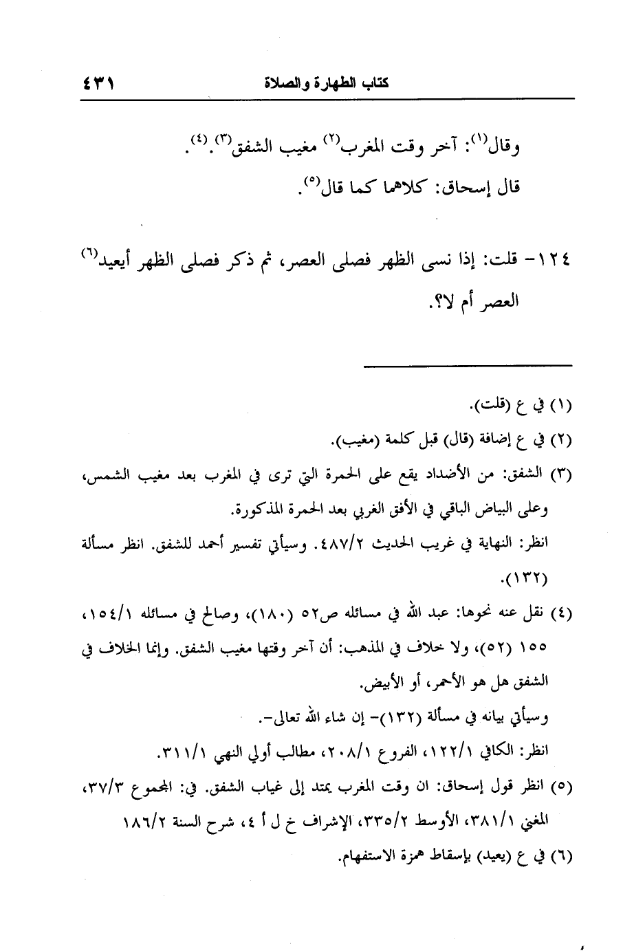 5 انظر قول إسحاق: ان وقت المغرب يمتد إلى غياب الشفق. في: المجموع 3/37، المغني 1/381، الأوسط 2/335، الإشراف خ ل أ 4، شرح السنة 2/186