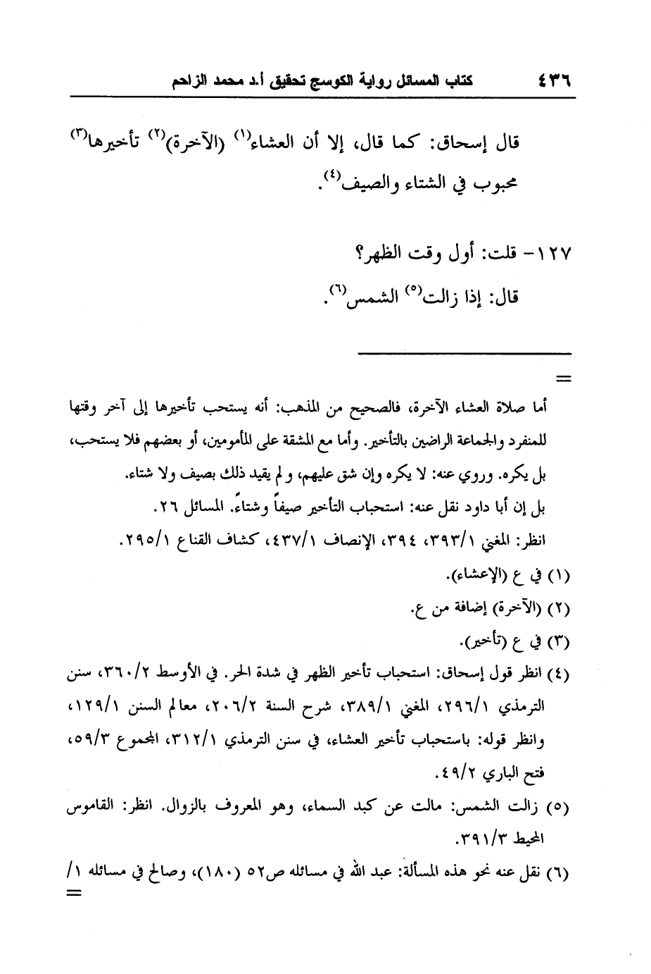 4 انظر قول إسحاق: استحباب تأخير الظهر في شدة الحر. في الأوسط 2/360، سنن الترمذي 1/296، المغني 1/389، شرح السنة 2/206، معالم السنن 1/129، وانظر قوله: باستحباب تأخير العشاء، في سنن الترمذي 1/312، المجموع 3/59، فتح الباري 2/49.