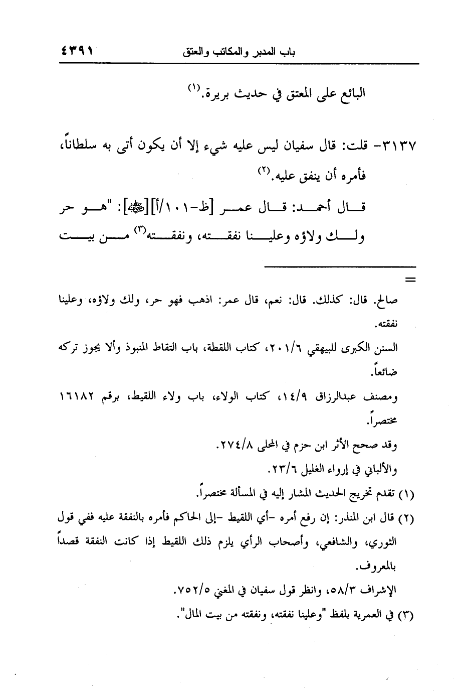 قال أحمد: قال عمر [ظ-101/أ] [رضي الله عنه] : "هو حر ولك ولاؤه وعلينا نفقته، ونفقته3 من بيت