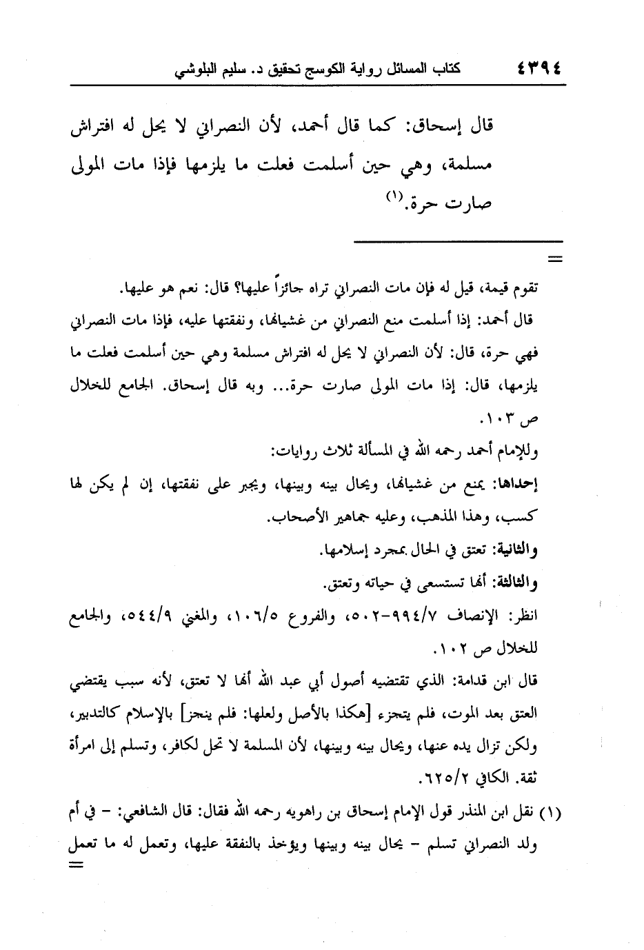 1 نقل ابن المنذر قول الإمام إسحاق بن راهويه رحمه الله فقال: قال الشافعي: - في أم ولد النصراني تسلم - يحال بينه وبينها ويؤخذ بالنفقة عليها، وتعمل له ما تعمل مثلها، وتعتق بموته، وبه قال أحمد وإسحاق كذلك.