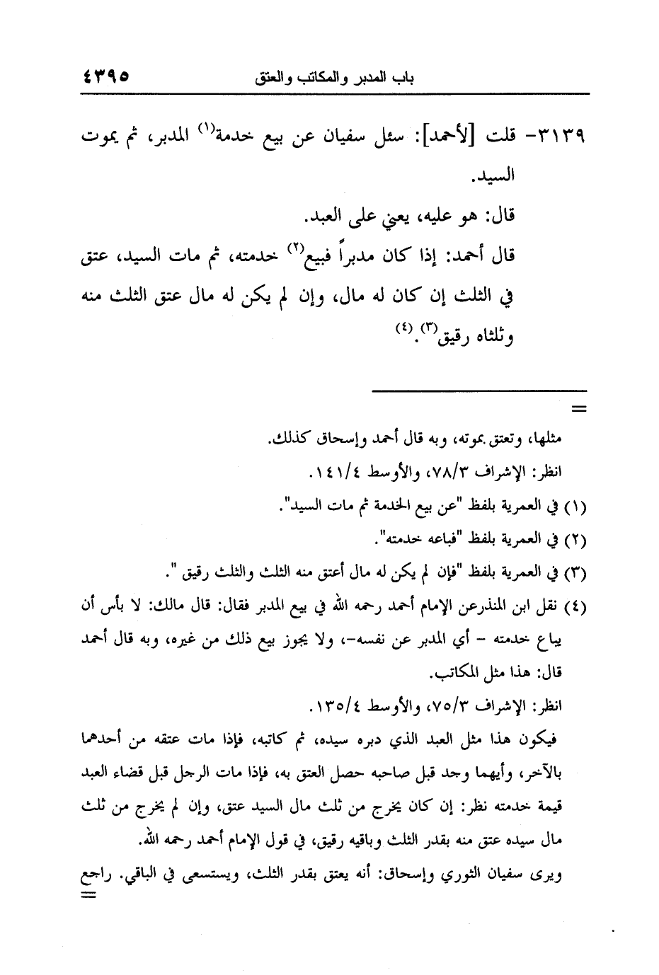 4 نقل ابن المنذرعن الإمام أحمد رحمه الله في بيع المدبر فقال: قال مالك: لا بأس أن يباع خدمته - أي المدبر عن نفسه-، ولا يجوز بيع ذلك من غيره، وبه قال أحمد قال: هذا مثل المكاتب.