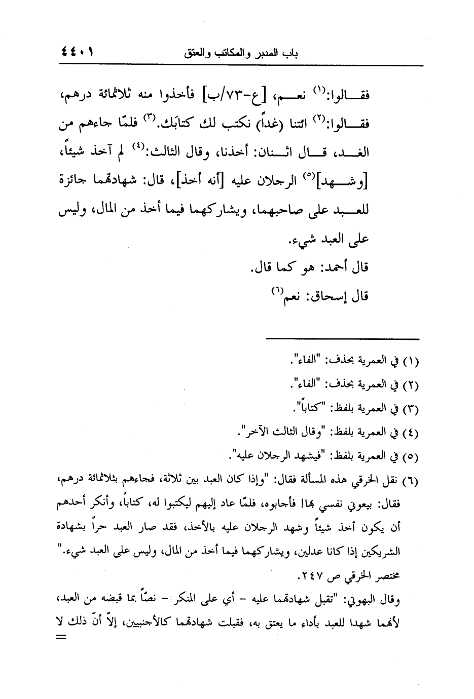 6 نقل الخرقي هذه المسألة فقال: "وإذا كان العبد بين ثلاثة، فجاءهم بثلاثمائة درهم، فقال: بيعوني نفسي بها! فأجابوه، فلمّا عاد إليهم ليكتبوا له، كتاباً، وأنكر أحدهم أن يكون أخذ شيئاً وشهد الرجلان عليه بالأخذ، فقد صار العبد حراً بشهادة الشريكين إذا كانا عدلين، ويشاركهما فيما أخذ من المال، وليس على العبد شيء."