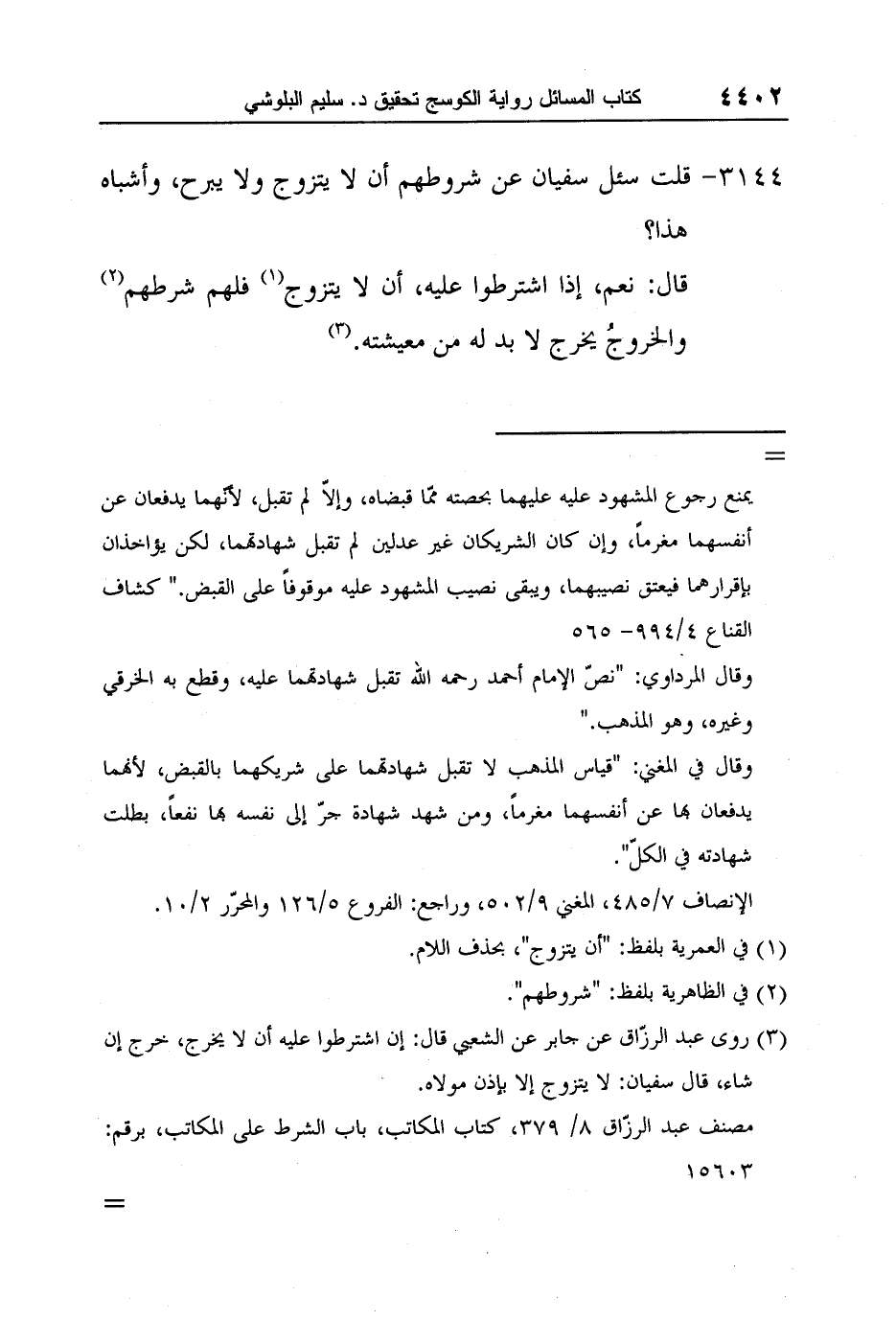3 روى عبد الرزّاق عن جابر عن الشعبي قال: إن اشترطوا عليه أن لا يخرج، خرج إن شاء، قال سفيان: لا يتزوج إلا بإذن مولاه.