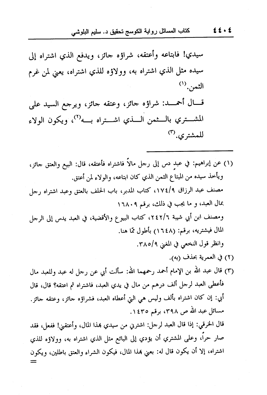3 قال عبد الله بن الإمام أحمد رحمهما الله: سألت أبي عن رجل له عبد وللعبد مال فأعطى العبد لرجل ألف درهم من مال في يدي العبد، فاشتراه ثم اعتقه؟ قال، قال أبي: إن كان اشتراه بألف وليس هي التي أعطاه العبد، فشراؤه جائز، وعتقه جائز. مسائل عبد الله ص 398، برقم 1435.
