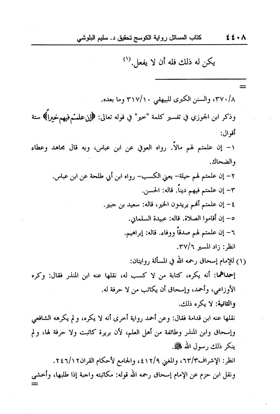 ونقل ابن حزم عن الإمام إسحاق رحمه الله قوله: مكاتبته واجبة إذا طلبها، وأخشى أن يأثم إن لم يفعل ذلك، ولا [] يجبره الحاكم على ذلك. المحلى 9/223-224.