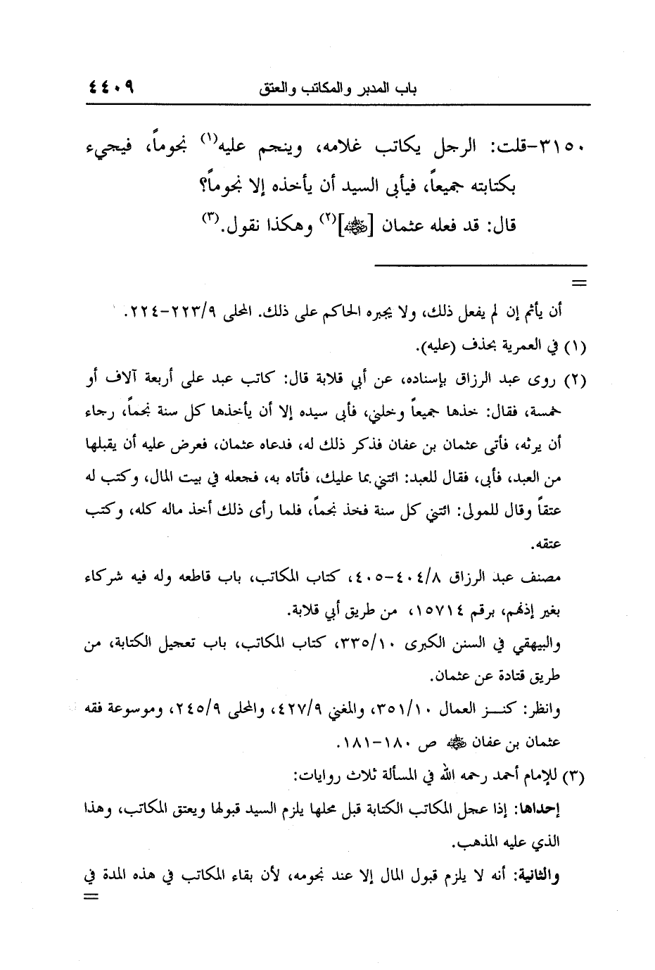 2 روى عبد الرزاق بإسناده، عن أبي قلابة قال: كاتب عبد على أربعة آلاف أو خمسة، فقال: خذها جميعاً وخلني، فأبى سيده إلا أن يأخذها كل سنة نجماً، رجاء أن يرثه، فأتى عثمان بن عفان فذكر ذلك له، فدعاه عثمان، فعرض عليه أن يقبلها من العبد، فأبى، فقال للعبد: ائتني بما عليك، فأتاه به، فجعله في بيت المال، وكتب له عتقاً وقال للمولى: ائتني كل سنة فخذ نجماً، فلما رأى ذلك أخذ ماله كله، وكتب عتقه.