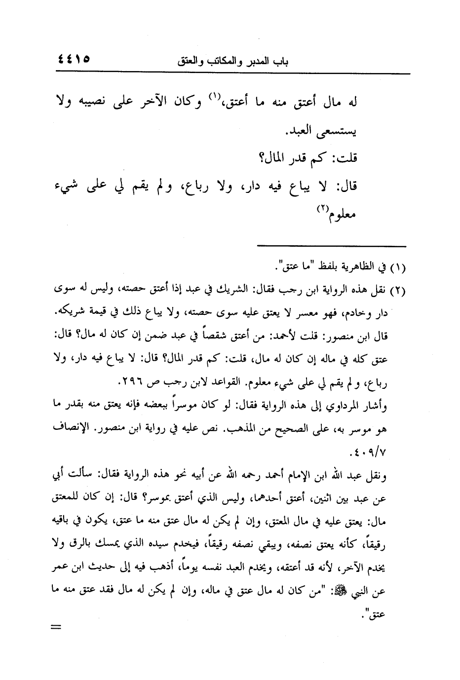 2 نقل هذه الرواية ابن رجب فقال: الشريك في عبد إذا أعتق حصته، وليس له سوى دار وخادم، فهو معسر لا يعتق عليه سوى حصته، ولا يباع ذلك في قيمة شريكه. قال ابن منصور: قلت لأحمد: من أعتق شقصاً في عبد ضمن إن كان له مال؟ قال: عتق كله في ماله إن كان له مال، قلت: كم قدر المال؟ قال: لا يباع فيه دار، ولا رباع، ولم يقم لي على شيء معلوم. القواعد لابن رجب ص 296.