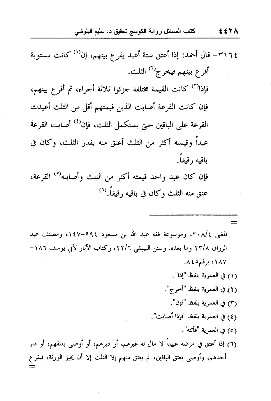 [3164-] قال أحمد: إذا أعتق ستة أعبد يقرع بينهم، إن1 كانت مستوية أقرع بينهم فيخرج2 الثلث.