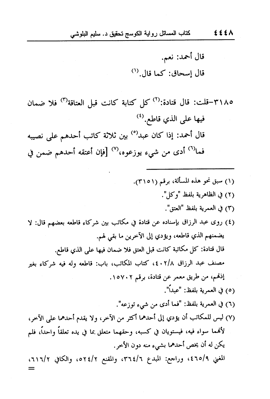4 روى عبد الرزاق بإسناده عن قتادة في مكاتب بين شركاء قاطعه بعضهم قال: لا يضمنهم الذي قاطعه، ويؤدي إلى الآخرين ما بقي لهم.