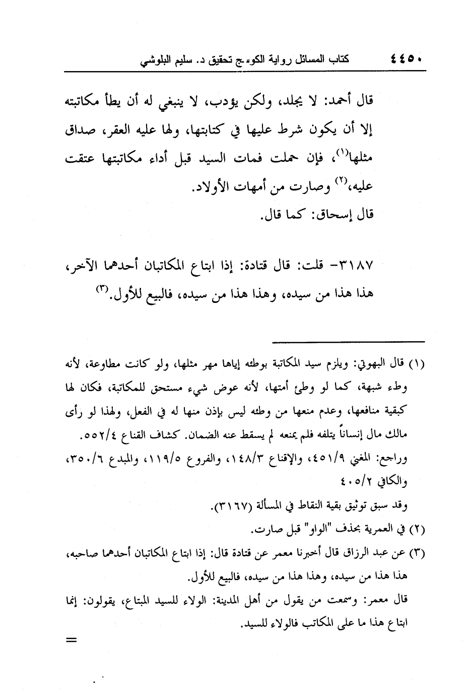 [3187-] قلت: قال قتادة: إذا ابتاع المكاتبان أحدهما الآخر، هذا هذا من سيده، وهذا هذا من سيده، فالبيع للأول.3
