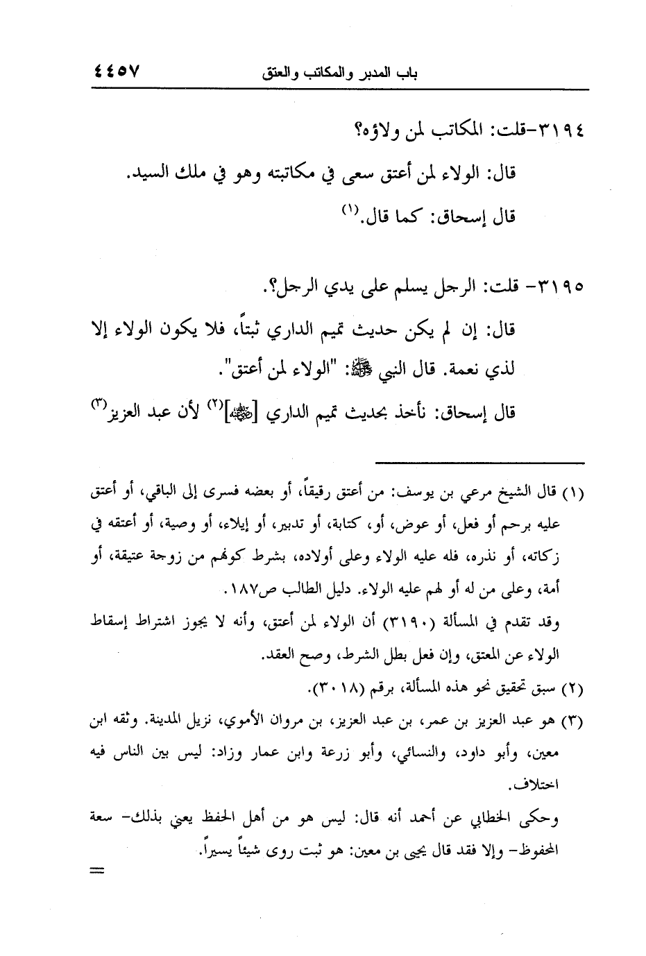 1 قال الشيخ مرعي بن يوسف: من أعتق رقيقاً، أو بعضه فسرى إلى الباقي، أو أعتق عليه برحم أو فعل، أو عوض، أو، كتابة، أو تدبير، أو إيلاء، أو وصية، أو أعتقه في زكاته، أو نذره، فله عليه الولاء وعلى أولاده، بشرط كونهم من زوجة عتيقة، أو أمة، وعلى من له أو لهم عليه الولاء. دليل الطالب ص187.