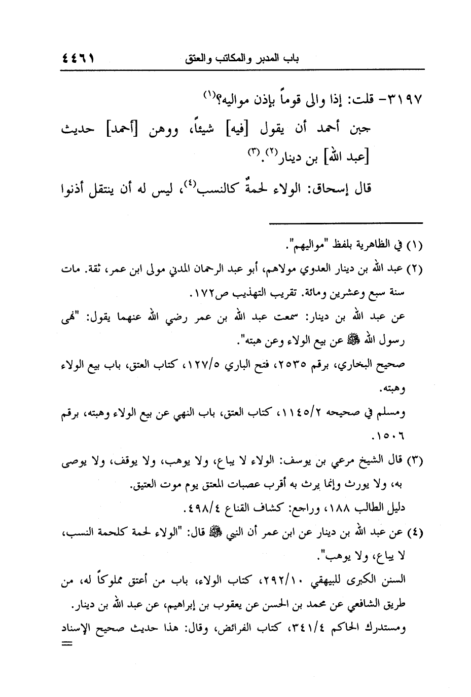 4 عن عبد الله بن دينار عن ابن عمر أن النبي صلى الله عليه وسلم قال: "الولاء لحمة كلحمة النسب، لا يباع، ولا يوهب".