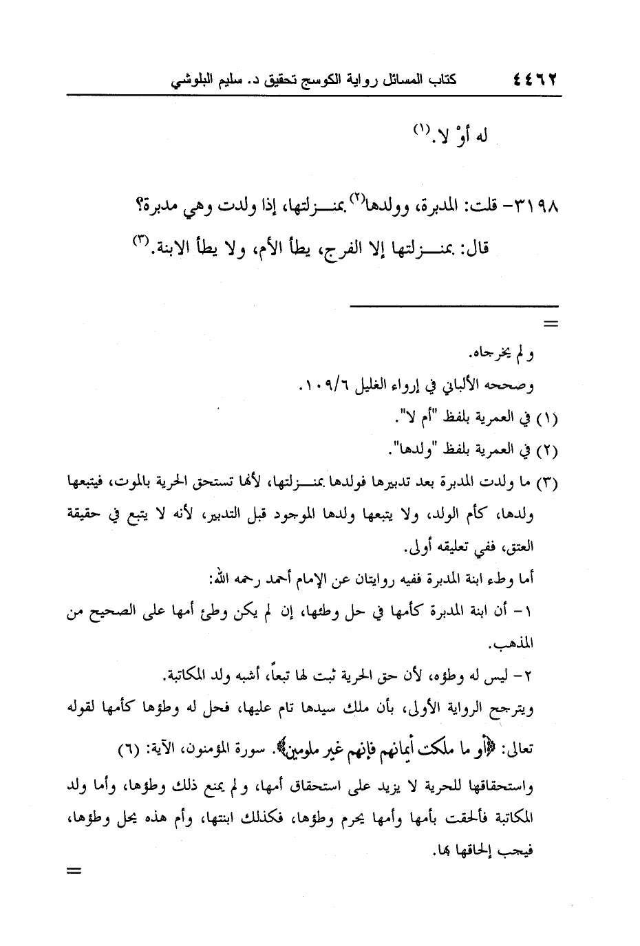 ويترجح الرواية الأولى، بأن ملك سيدها تام عليها، فحل له وطؤها كأمها لقوله تعالى: {أَوْ مَا مَلَكَتْ أَيْمَانُهُمْ فَإِنَّهُمْ غَيْرُ مَلُومِينَ} . سورة المؤمنون، الآية: (6)