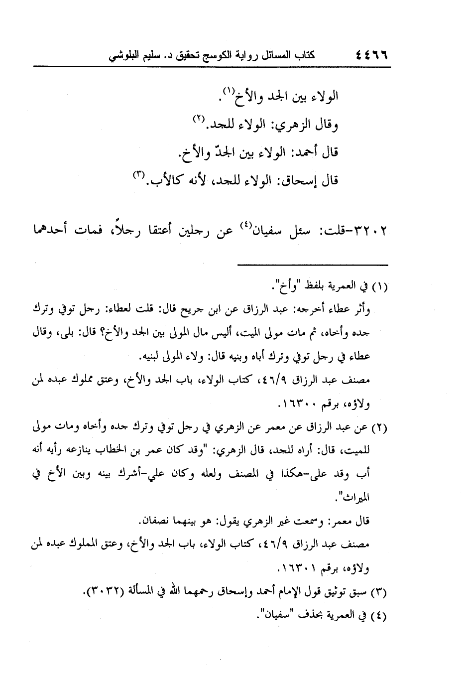 2 عن عبد الرزاق عن معمر عن الزهري في رجل توفي وترك جده وأخاه ومات مولى للميت، قال: أراه للجد، قال الزهري: "وقد كان عمر بن الخطاب ينازعه رأيه أنه أب وقد على-هكذا في المصنف ولعله وكان علي-أشرك بينه وبين الأخ في الميراث".