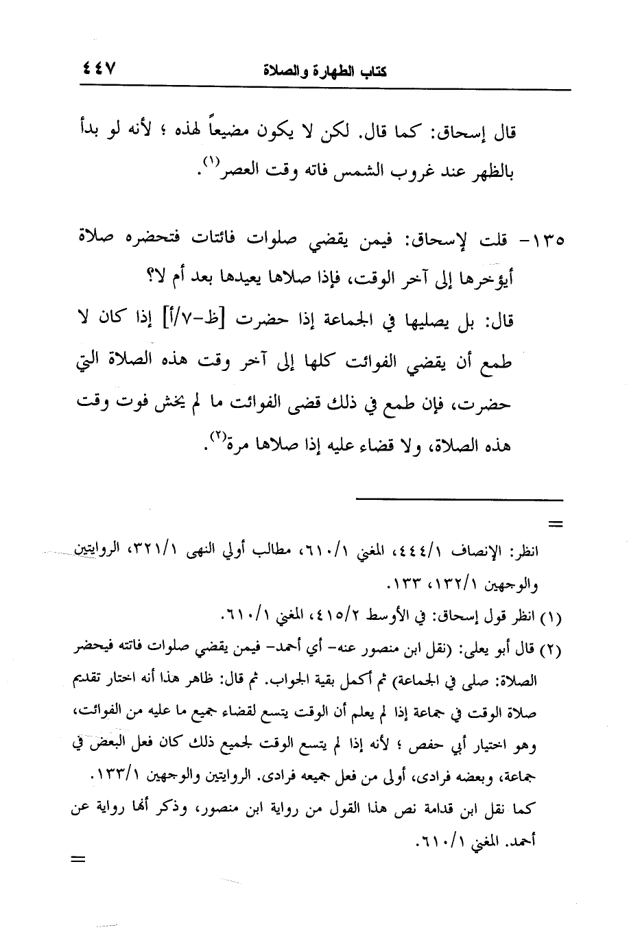 وأما الإمام أحمد- رحمه الله تعالى- فما أفتى به في هذه المسائل هو وجوب الترتيب في قضاء الفوائت، حتى ولو أدرك الجماعة، كما في مسألة (281) وما أفتى به إسحاق هنا موافق لما أفتى به في مسألة (281) .