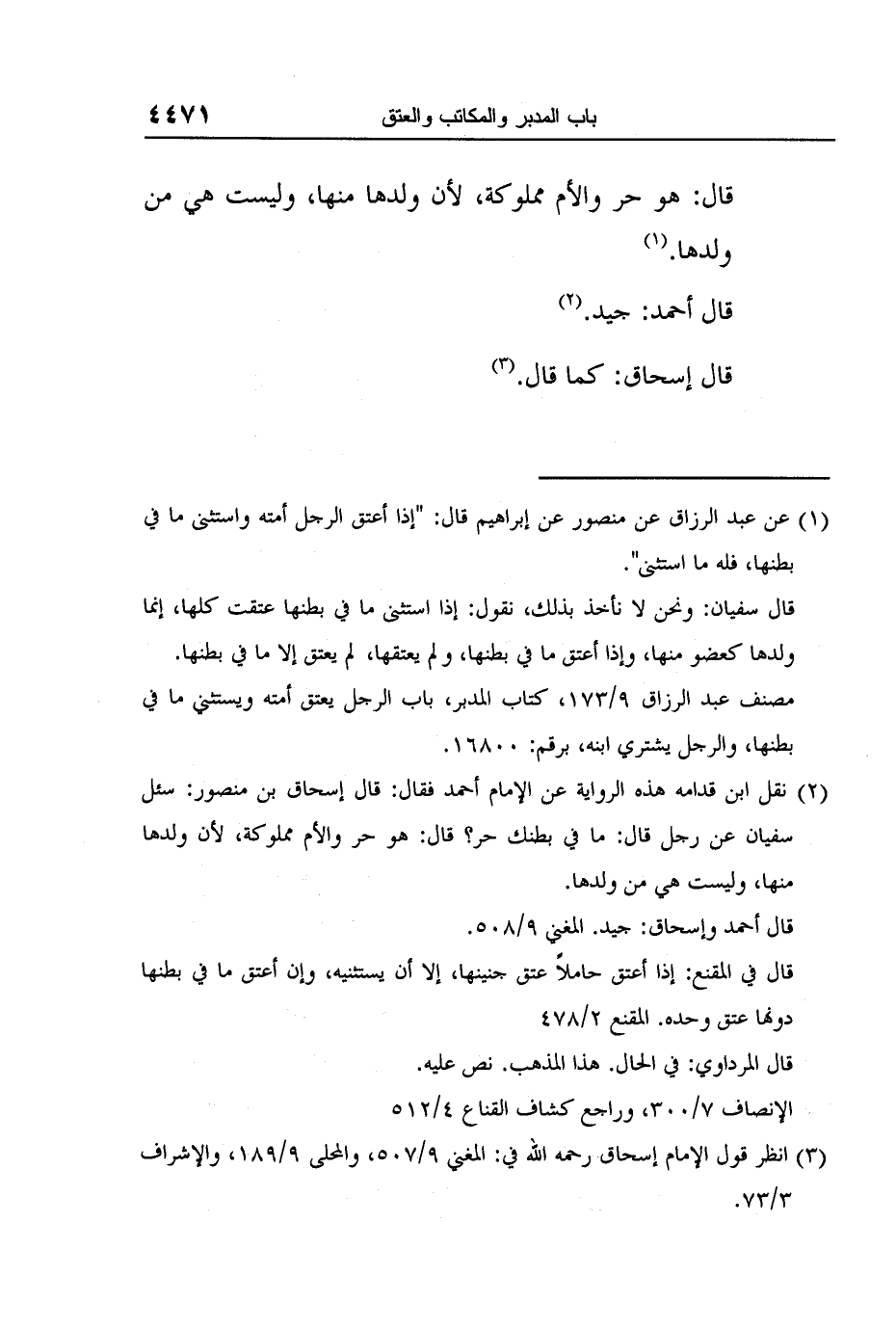 2 نقل ابن قدامه هذه الرواية عن الإمام أحمد فقال: قال إسحاق بن منصور: سئل سفيان عن رجل قال: ما في بطنك حر؟ قال: هو حر والأم مملوكة، لأن ولدها منها، وليست هي من ولدها.
