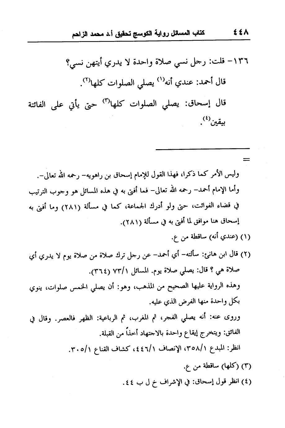 2 قال ابن هانئ: سألته- أي أحمد- عن رجل ترك صلاة من صلاة يوم لا يدري أي صلاة هي؟ قال: يصلي صلاة يوم. المسائل 1/73 (364) .