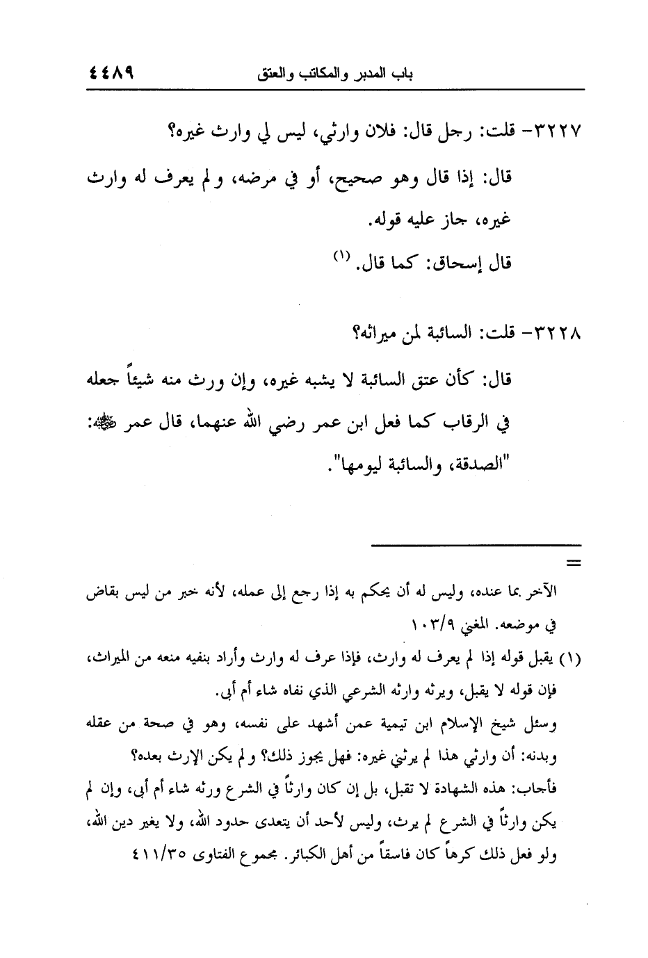 قال: كأن عتق السائبة لا يشبه غيره, وإن ورث منه شيئاً جعله في الرقاب كما فعل ابن عمر رضي الله عنهما، قال عمر رضي الله عنه: "الصدقة, والسائبة ليومها".