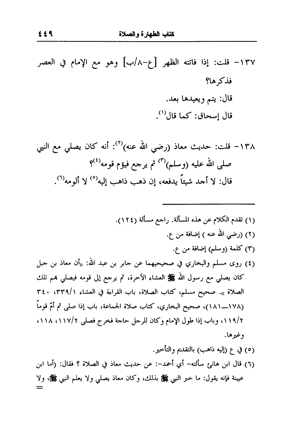 4 روى مسلم والبخاري في صحيحيهما عن جابر بن عبد الله: "أن معاذ بن جبل كان يصلي مع رسول الله صلى الله عليه وسلم العشاء الآخرة، ثم يرجع إلى قومه فيصلي بهم تلك الصلاة ". صحيح مسلم، كتاب الصلاة، باب القراءة في العشاء 1/339، 340 (178ـ181) ، صحيح البخاري، كتاب صلاة الجماعة، باب إذا صلى ثم أمّ قوماً 2/119، وباب إذا طول الإمام وكان للرجل حاجة فخرج فصلى 2/117، 118، وغيرها.