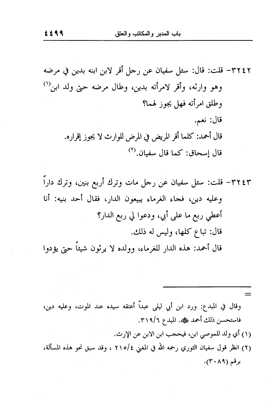2 انظر قول سفيان الثوري رحمه الله في المغني 4/215 , وقد سبق نحو هذه المسألة، برقم (3089) .