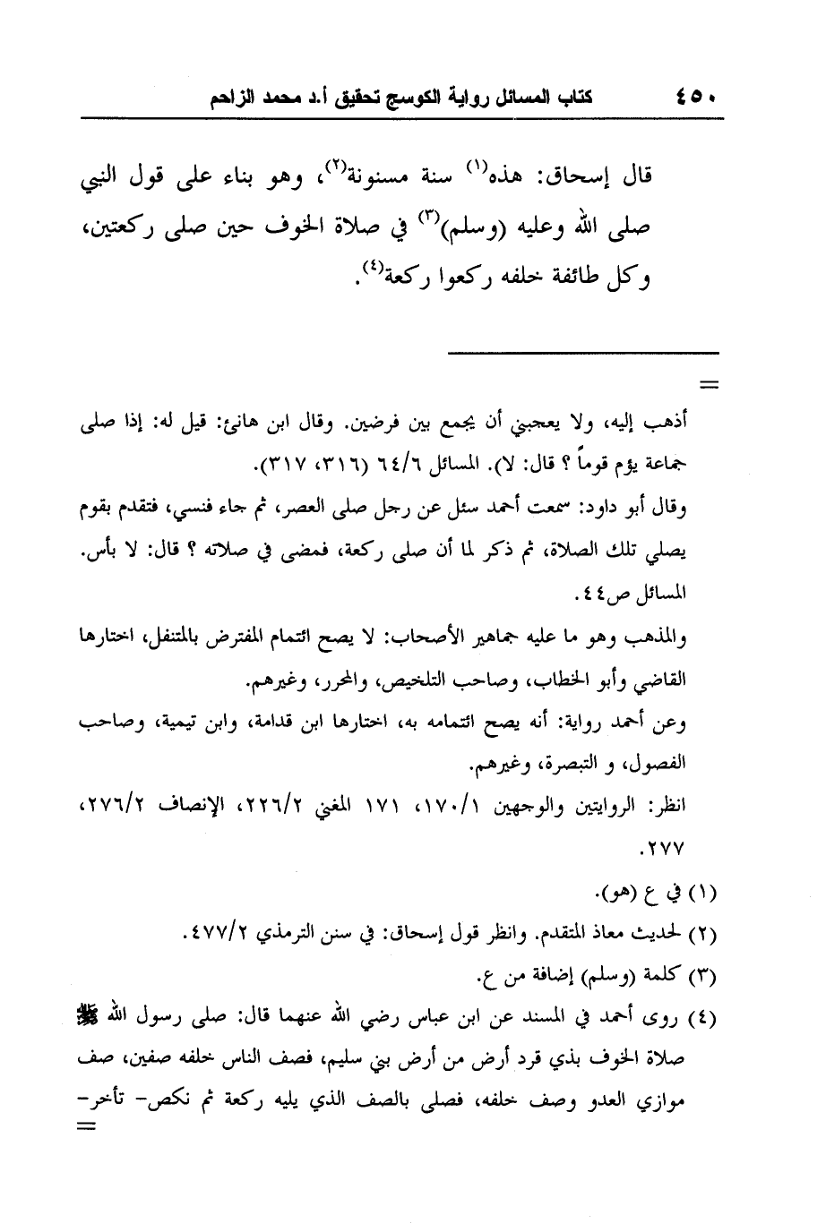 قال إسحاق: هذه1 سنة مسنونة2، وهو بناء على قول النبي صلى الله وعليه (وسلم) 3 في صلاة الخوف حين صلى ركعتين، وكل طائفة خلفه ركعوا ركعة4.