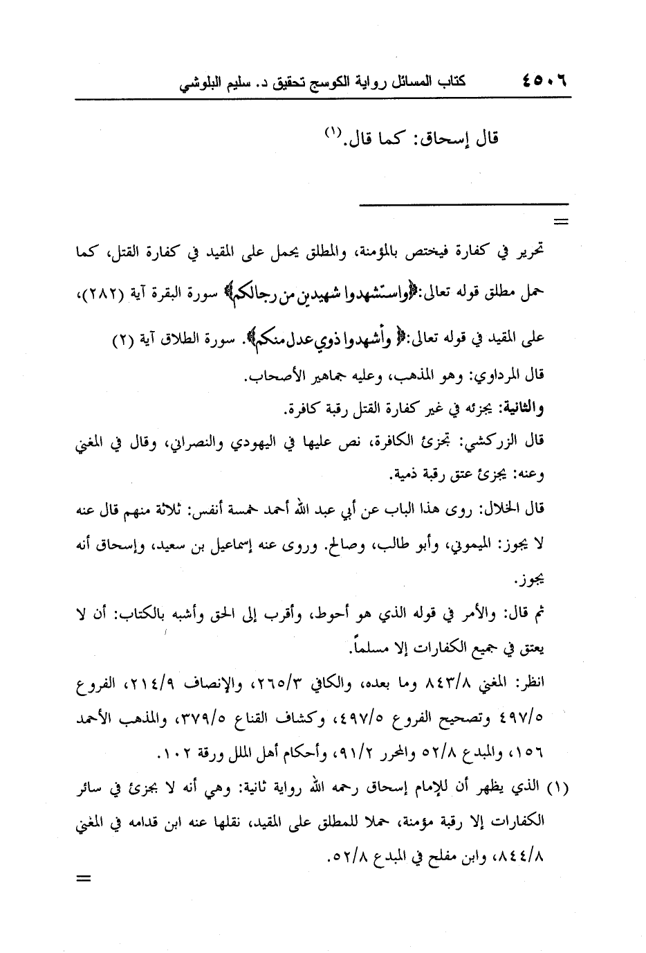1 الذي يظهر أن للإمام إسحاق رحمه الله رواية ثانية: وهي أنه لا بجزئ في سائر الكفارات إلا رقبة مؤمنة, حملا للمطلق على المقيد، نقلها عنه ابن قدامه في المغني 8/844, وابن مفلح في المبدع 8/52.