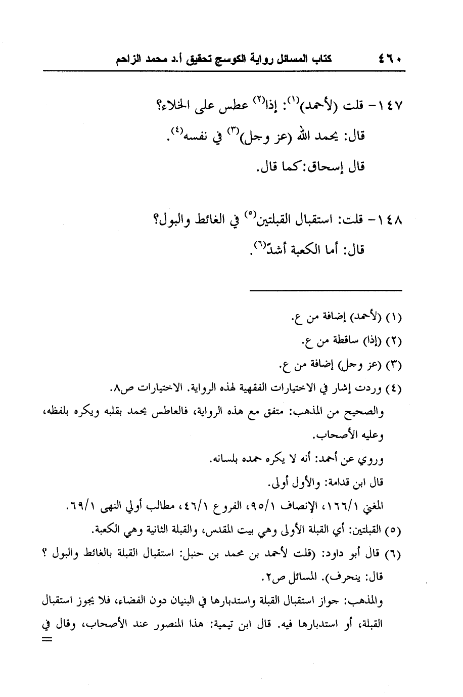 6 قال أبو داود: (قلت لأحمد بن محمد بن حنبل: استقبال القبلة بالغائط والبول؟ قال: ينحرف) . المسائل ص2.