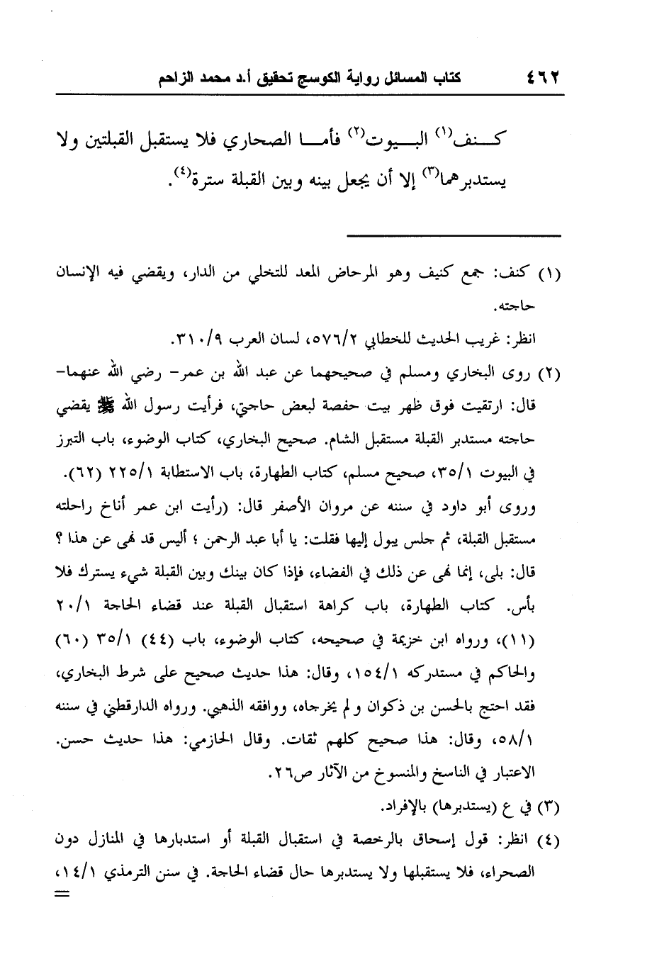 4 انظر: قول إسحاق بالرخصة في استقبال القبلة أو استدبارها في المنازل دون الصحراء، فلا يستقبلها ولا يستدبرها حال قضاء الحاجة. في سنن الترمذي 1/14، التمهيد 1/309، شرح مسلم للنووي 3/154، الأوسط 1/327، المجموع 2/84، شرح السنة 1/359، الاعتبار للحازمي ص26، عمدة القاري 2/262.