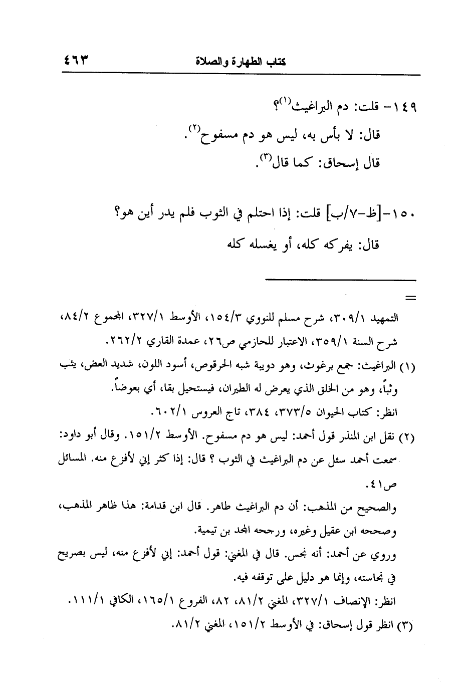 2 نقل ابن المنذر قول أحمد: ليس هو دم مسفوح. الأوسط 2/151. وقال أبو داود: سمعت أحمد سئل عن دم البراغيث في الثوب؟ قال: إذا كثر إني لأفزع منه. المسائل ص41.