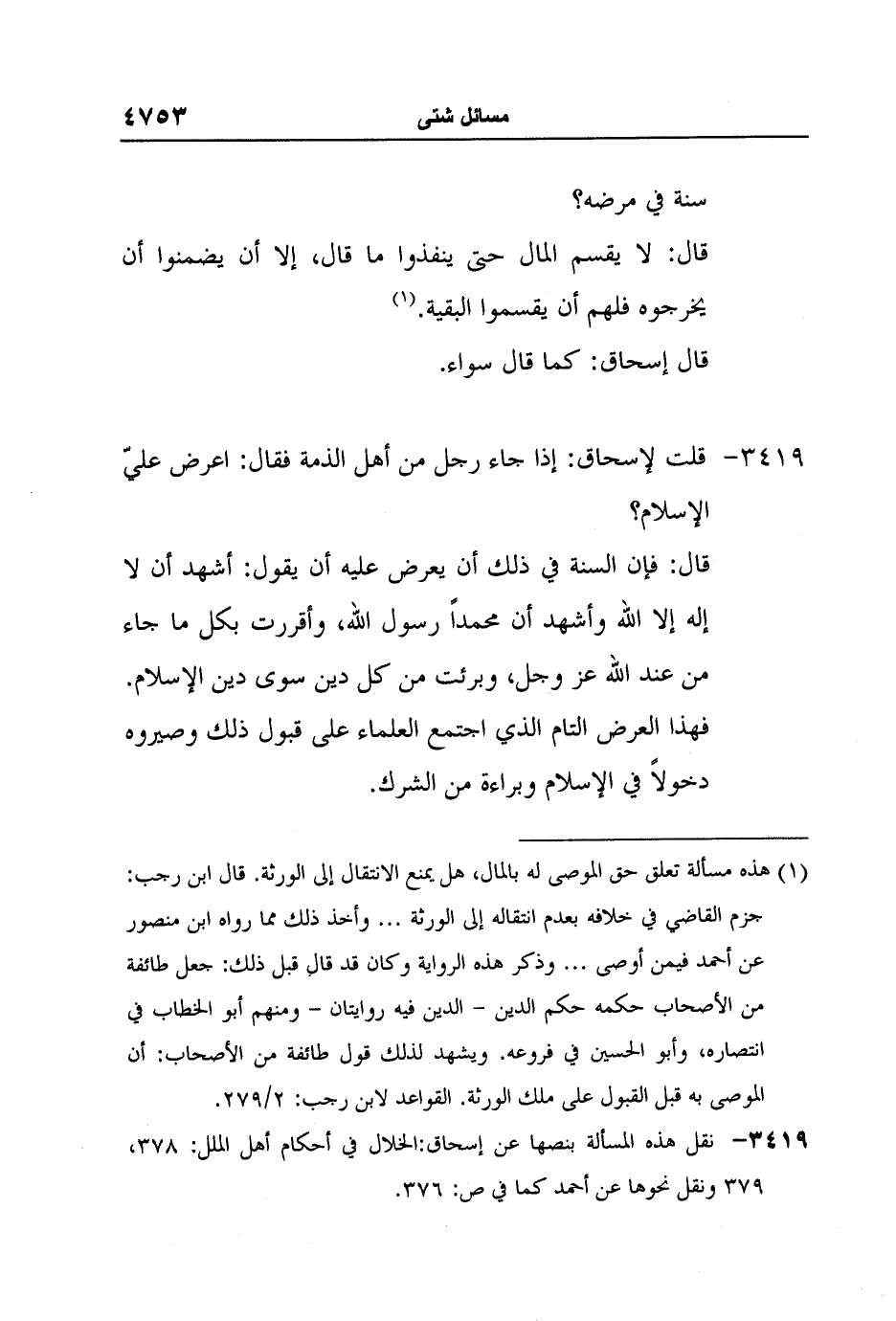 [3419-*] نقل هذه المسألة بنصها عن إسحاق: الخلال في أحكام أهل الملل: 378، 379 ونقل نحوها عن أحمد كما في ص: 376.
