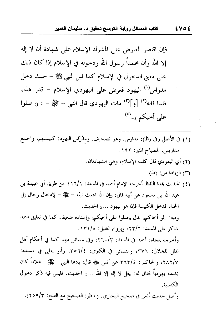 4 الحديث بهذا اللفظ أخرجه الإمام أحمد في المسند: 1/416 من طريق أبي عبيدة بن عبد الله بن مسعود عن أبيه قال: "إن الله ابتعث نبيّه - صلى الله عليه وسلم - لإدخال رجال إلى الجنة، فدخل الكنيسة فإذا هو بيهود ... " الحديث.