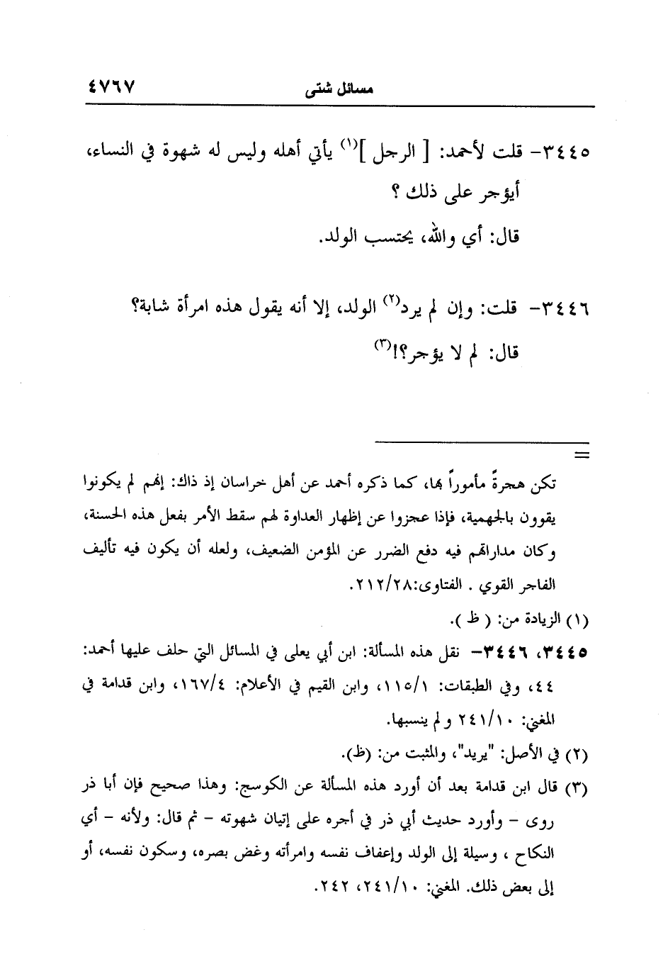 [3445، 3446-*] نقل هذه المسألة: ابن أبي يعلى في المسائل التي حلف عليها أحمد: 44، وفي الطبقات: 1/115، وابن القيم في الأعلام: 4/167، وابن قدامة في المغني: 10/241 ولم ينسبها.