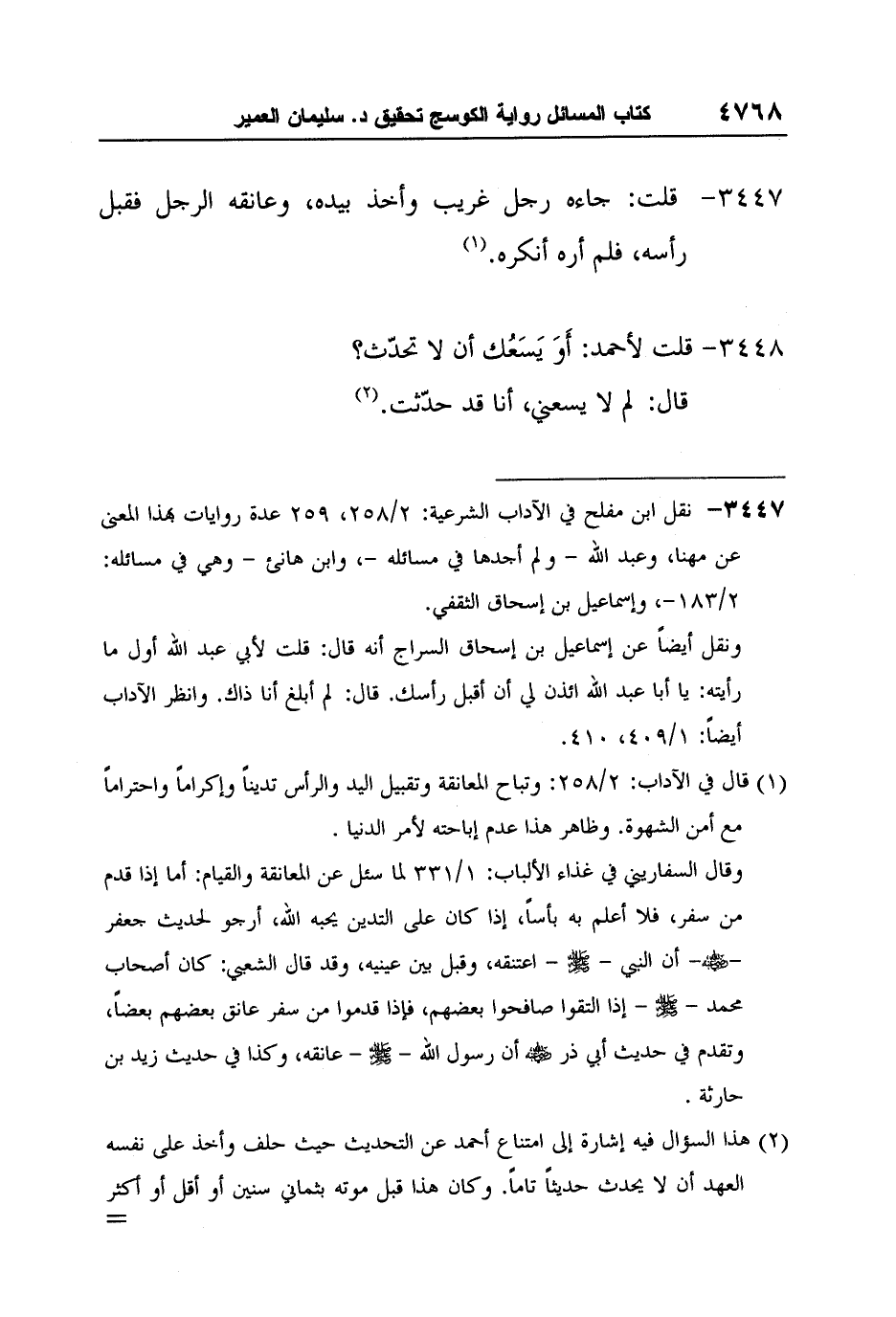 [3447-*] نقل ابن مفلح في الآداب الشرعية: 2/258، 259 عدة روايات بهذا المعنى عن مهنا، وعبد الله -[] ولم أجدها في مسائله -، وابن هانئ - وهي في مسائله: 2/183-، وإسماعيل بن إسحاق الثقفي.