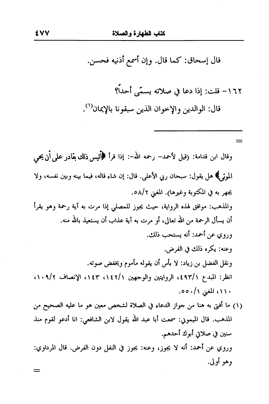 1 ما أفتى به هنا من جواز الدعاء في الصلاة لشخص معين هو ما عليه الصحيح من المذهب. قال الميموني: سمعت أبا عبد الله يقول لابن الشافعي: انا أدعو لقوم منذ سنين في صلاتي أبوك أحدهم.